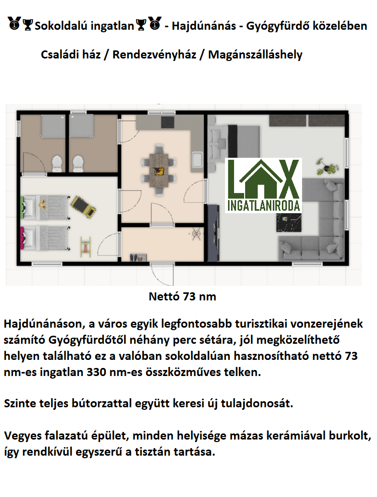 Jelenleg rendezvényház, de mi rövidtávú kiadással szeretnénkhasznosítani.